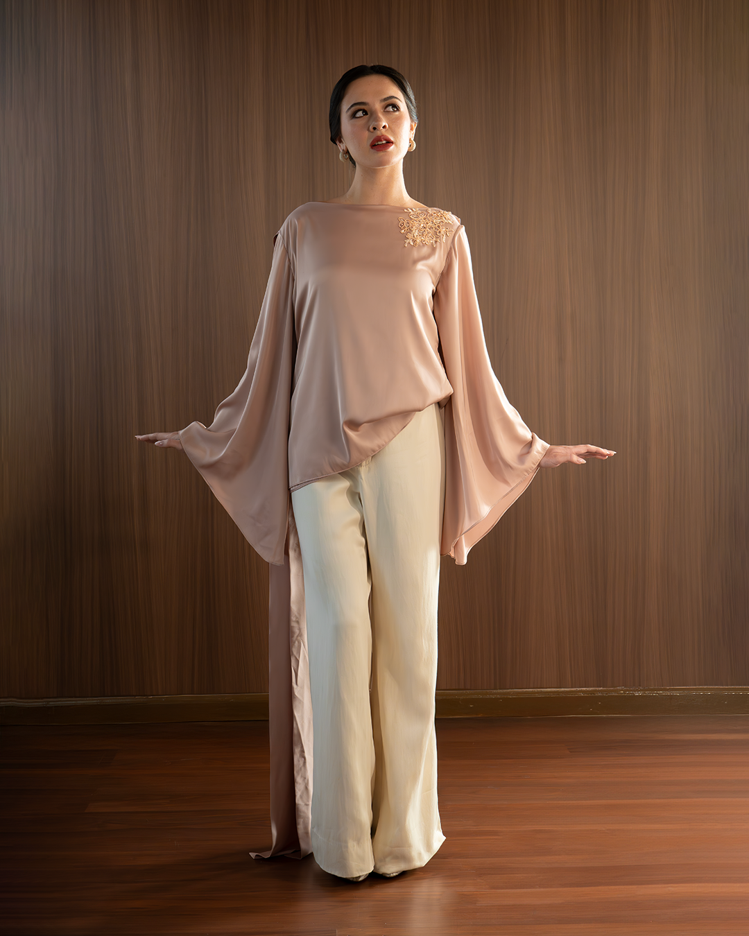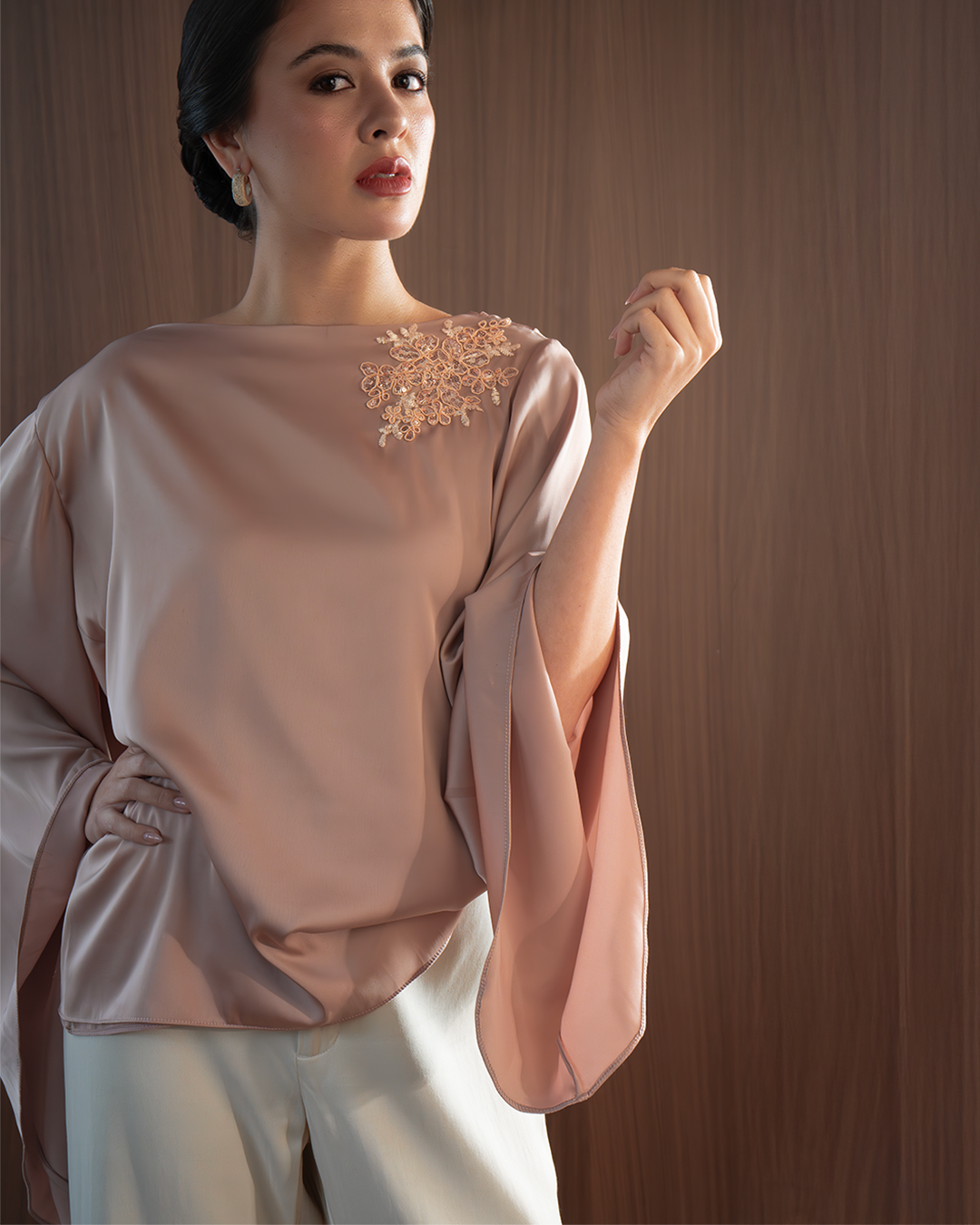 A muted ballet apricot, graceful in its fall. The angel-cut sleeves drift with the lightest movement, creating an ease that feels instinctive, never forced. At the shoulder, an intricately hand-sewn and cut peach lace appliqué lends a touch of heritage detail, like jewelry laid against silk.