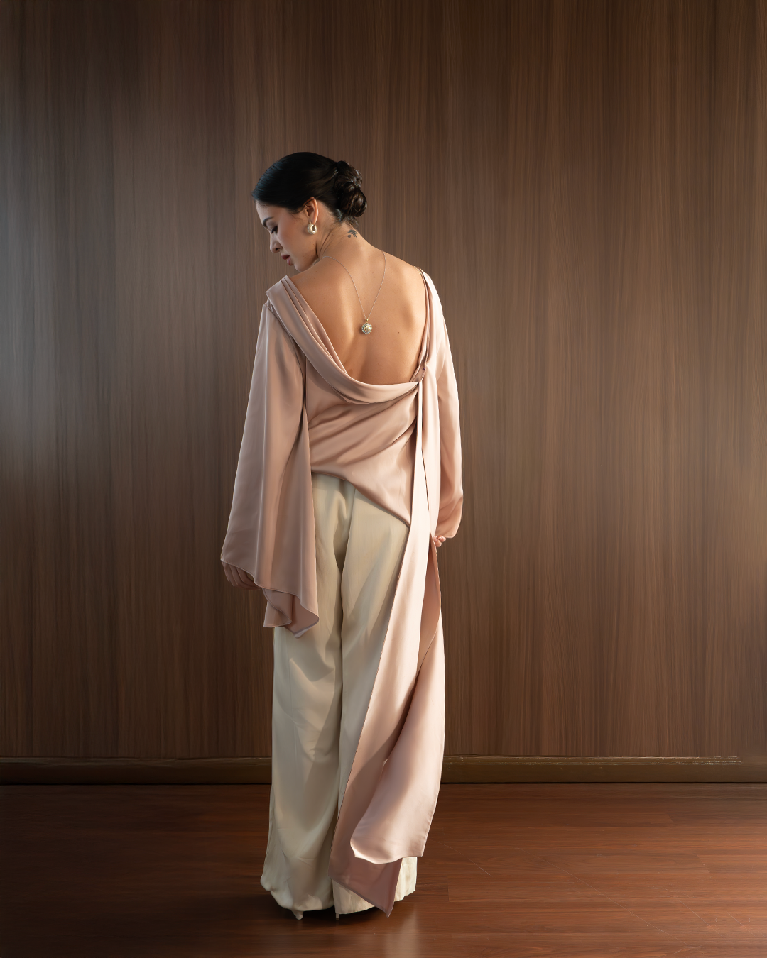 At the back, a gentle cowl drape reveals itself—subtle, sensual—anchored by long ties that trail with a sense of occasion. It is a piece made not for grandeur, but for quiet confidence: effortless, assured, and quietly unforgettable.